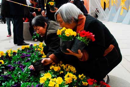 趙亞輝在博客上說,自己正在參加由人民日報組織的跨時代回訪———“重走中國西北角”,4月4日正好趕上了一年一度在黃帝陵舉行的清明節(jié)公祭黃帝大典。自己祭拜完黃帝陵后,下山時再次途徑舉行大典的軒轅殿,卻被眼前的景象驚呆了:“廣場上不少人手里抱著一盆盆、一束束花,還有很多人正在搶著把擺放在大殿上下臺子上的小花盆拿走。
