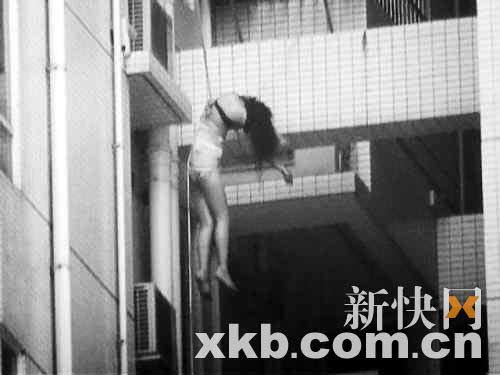 本月6日上午7時,東風東路東風廣場內的清潔公司蕭姓女工第一個目睹了懸掛在該樓橫梁上的女尸。據當時媒體公布的圖片,死者身上半裸,除了內衣內褲外再沒有穿其他衣物,更為恐怖的是,其尸體竟然懸掛在該廣場麗豪閣T7棟12樓和13樓之間。