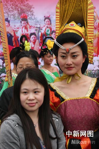 中新網(wǎng)4月19日電 (李洋)4月正是牡丹盛開的時節(jié)!熬W(wǎng)上看河南”采風(fēng)團(tuán)18日先后探訪了洛陽國際牡丹園和國家牡丹園,遍賞中國和世界的名貴牡丹品種。當(dāng)?shù)剡組織演藝團(tuán)體盛裝重現(xiàn)唐朝武則天時期的風(fēng)貌,不少女記者對武則天這一歷史人物情有獨(dú)鐘,還紛紛與“武則天”合影留念。