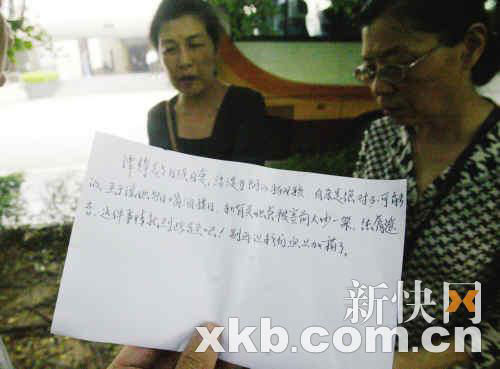 昨日追悼會(huì)舉行前,到場幾家媒體記者擔(dān)心打擾譚母,一直未曾上前與其交談,只是遠(yuǎn)遠(yuǎn)看著,直到譚靜好友都已經(jīng)到齊,追悼會(huì)馬上開始的時(shí)候,觀察譚母精神略好了一些方才走近,向其問好后交談了不到一分鐘,期間譚母聽得多,回答得少,在采訪的最后,譚母忽然從包里拿出一張事先寫好的紙條展開,“要說的全在里面了!庇浾呖吹,紙條上寫著如下的話語,“譚靜是個(gè)自強(qiáng)自愛、活潑開朗的好女孩,自殺是絕對(duì)不可能的,至于說她每日喝酒度日,和有關(guān)她爸被害前大吵一架,純屬謠言,這事情就到此為止吧,別再讓我們雪上加霜了。”展示完紙條后,譚母回到靈堂里參加追悼會(huì)了。