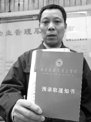 4月8日,50多歲的黃師傅終于收到了南京農(nóng)業(yè)大學(xué)工學(xué)院成人自考的錄取通知書。然而,通知書上的報名截止日期是1月31日。原來,這封通知書在珠江路北門橋高層小區(qū)物業(yè)門衛(wèi)室里“躺”了3個月。黃師傅說,要想再拿到這樣大紅的錄取通知書,又要“苦”上一年。