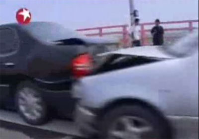 從慈溪往海鹽的大橋上,發(fā)生十車連環(huán)相撞事故。(東方衛(wèi)視截圖)