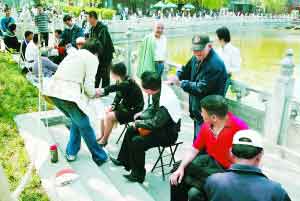 近日,隨著節(jié)假日游客的增多,(北京)后海荷花市場旁悄然興起的街頭按摩行業(yè)越發(fā)紅火,這些“按摩師”把目標(biāo)投向了來后海觀光的游客們,一些因長時間步行而勞累的游客對此也顯得頗有興趣。 (李剛攝)