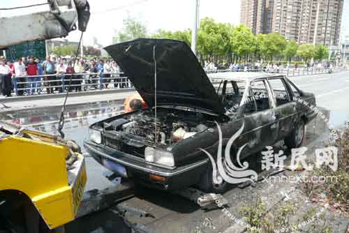 新民網(wǎng)記者看到,這輛車牌號為滬BT91**的桑塔納轎車已被燒得面目全非,駕駛室和發(fā)動機也全部被燒毀,汽車前后引擎蓋被燒得翹起,整個車被大火燒得僅剩下一個鐵殼。