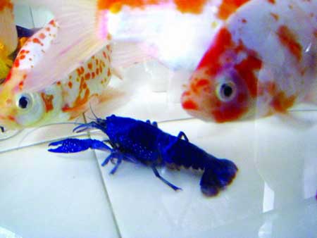 然而,由于這只龍蝦穿著罕見的藍(lán)色“盔甲”,與旁邊的紅色龍蝦形成了鮮明的對比。它看起來很活潑,在魚缸中和觀賞魚一起嬉戲,紅的金魚、藍(lán)的龍蝦構(gòu)成一幅漂亮的畫面。