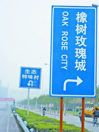 在鄭州市中州大道與南三環(huán)交叉口附近,記者先后看到兩個酷似交通路牌的廣告牌。藍色牌子上,分別寫著“橡樹玫瑰城”和“生態(tài)特味村”等字樣,而且都有白色箭頭指示方向。