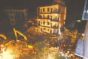 文化鎮(zhèn)中心;锸硤F職工曾家福介紹,綜合樓是1995年下半年建的,1996年秋投入使用。水泥欄桿掉光的教學(xué)樓是1994年所建。記者看到,綜合樓屬預(yù)制板式樓房,垮塌的廢墟中橫七豎八地倒著預(yù)制板,僅橫梁可見少量鋼筋。 記者冉啟虎