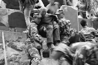 雨越下越大,很多戰(zhàn)士的迷彩服上全是泥水,已經(jīng)完全看不出顏色。幾個戰(zhàn)士抬著一名受傷的女孩,一路上不停地鼓勵著:“千萬不要睡著了!”