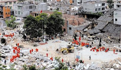 12日14時(shí)28分,平武縣南壩小學(xué),伴隨著巨大的轟鳴聲,地面突然開始劇烈搖晃,文具盒、書本從書桌上彈了下來。孩子們蜂擁著往樓下跑。地面的搖晃愈加劇烈,教學(xué)樓“轟”的一聲全部倒塌,800余名師生無一幸免,全被壓在廢墟下面。此刻,小鎮(zhèn)的房子也成片倒塌,老街的平房瞬間變成一堆廢墟,無數(shù)正在趕場的民眾被破碎的建筑掩埋。一個(gè)常住人口近萬人的小鎮(zhèn),瞬間被夷為平地。