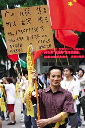 昨日,有一個人,隨著號召募捐行動的志愿者隊伍,從正佳廣場西北門的活動現(xiàn)場一直跟到另一主會場僑鑫教育大院。他始終默默站著,沒和任何人說話;而他手上,則舉著一塊自己制作的簡陋牌子,上面寫著“廣州市民抗震救災售賣樓王”,引來好多路人觀望。