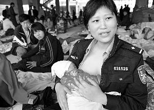 14日,蔣小娟來到災(zāi)民帳篷區(qū),看到四名嬰兒只能吃一些水和稀飯,一名嬰兒的母親還在醫(yī)院搶救!八麄?nèi)鞗]有吃奶了!笔Y小娟撩起衣衫露出乳房,輕輕地將乳頭塞進(jìn)嬰兒的嘴里。