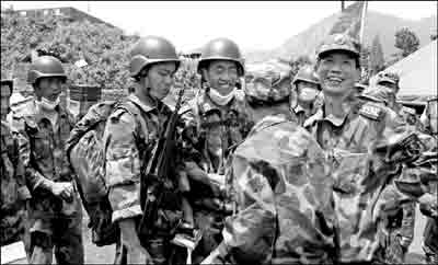 “我們來唱支軍歌吧!2008年5月18日11時(shí)30分,空降兵某軍指揮官戴志強(qiáng)站在已成孤島的綿竹市三江村,對(duì)前方奔騰而來的巨石大喊時(shí),56名災(zāi)民已乘坐直升機(jī)安然離去。