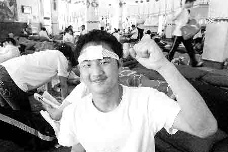 相識的同學(xué)們在一起會驅(qū)散巨災(zāi)后的恐懼,血肉相連的兄弟在一起更具有生活的勇氣。在虹苑歌劇院里,記者還看到了一幕溫情的場面:弟弟在哥哥潔白的T恤上題詞:依然范特西,你親愛的老弟!