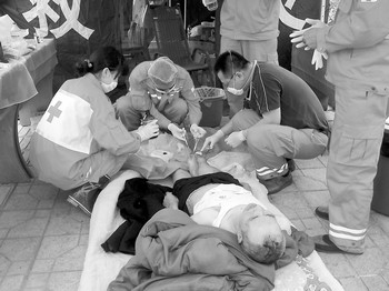 昨日,(四川省)彭州市人民醫(yī)院的重傷員手術(shù)基本完成,湖南醫(yī)療隊分批下到鄉(xiāng)鎮(zhèn),深入災(zāi)區(qū)最前線進(jìn)行救治工作。來自長沙市三醫(yī)院的任朝暉等醫(yī)務(wù)人員,驅(qū)車數(shù)百公里,步行3小時,趕到位于白鹿鎮(zhèn)的3個災(zāi)民點(diǎn),為400余名災(zāi)民進(jìn)行救治、防病。