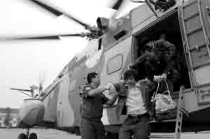 下午3點30分,抗震救災(zāi)指揮中心命令:“速赴清平鎮(zhèn)運送受困群眾!卑胄r后,領(lǐng)航員崔俊峰將航線數(shù)據(jù)輸入飛機駕駛艙右下方的多普勒導(dǎo)航計算機,將著陸點的經(jīng)緯度輸入機載GPS。很快,飛機座艙正前方的綜合顯示器屏幕上,彈出一幅電子地圖,一條彎彎曲曲的紅線代表此次飛行的航線。屏幕下方,還顯示著預(yù)計到達時間、航程、航向等數(shù)據(jù)!拔覀兇舜蔚暮骄就是這條紅線!倍叛┍钢@示屏告訴記者,“我們有先進的機載設(shè)備和過硬的機組人員,一定能快速高效完成任務(wù)!毕挛4點整,所有物資安放進艙,航空燃油添加完畢,杜雪冰也和機組戰(zhàn)友們完成了飛行前的最后一輪檢查,隨著塔臺的一聲令下,救援直升機拔地而起,迅速飛往清平鎮(zhèn)。