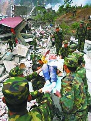 5月13日,武警戰(zhàn)士們從廢墟中營(yíng)救出了3歲的郎錚,他吃力地舉起傷痕累累的右手,向軍人叔叔們敬了少先隊(duì)禮。郎錚的舉動(dòng)被很多人評(píng)價(jià)為“地震中最溫情的畫面之一”。