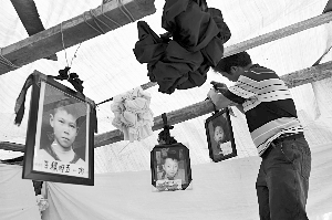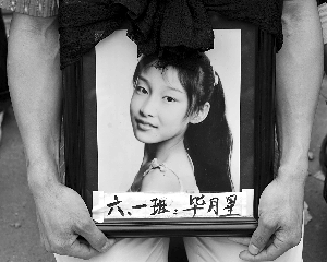 5月21日14時,綿竹市富新第二小學(xué)(簡稱“富新二小”)的正門至坍塌校舍之間的道路上,擠滿了前來祭奠遇難學(xué)生的家長們。捧于家長胸前的相框內(nèi),是127張曾經(jīng)鮮活的臉。