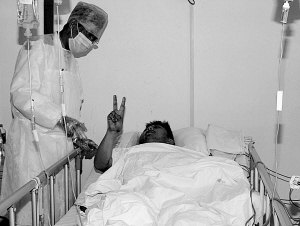 昨日清晨7點,經(jīng)過手術(shù)后的短時間恢復(fù),護士為馬元江送來了他獲救后的第一餐稀飯,護士小心翼翼地將50毫升的粥慢慢地喂他喝下。到了中午12點和下午3點,又分別喂他喝下了各50毫升的營養(yǎng)液。昨日下午6點,馬元江看到醫(yī)生和記者在隔離區(qū)探望時,忽然做出了一個勝利的手勢,讓在場的人非常感動。