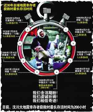 湖南的醫(yī)療隊(duì)介紹,7時(shí)許,老太太被抬上救護(hù)車(chē)緊急送往彭州醫(yī)院。從12日下午被埋開(kāi)始到被解救的196小時(shí),老太太沒(méi)有吃任何東西,只是間歇地喝了點(diǎn)雨水。醫(yī)生介紹,老太太神志比較清晰,已被送到成都華西醫(yī)院治療。