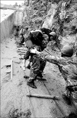 戰(zhàn)士們立即打著手電迎了過去。近了,越來越近了,在手電光中,40多個(gè)互相攙扶的人影出現(xiàn)在戰(zhàn)士們面前。戰(zhàn)士們話音未落,人群中哇地響起一片哭聲。戰(zhàn)士們趕忙迎上去將他們扶到洞口,然后每一名受災(zāi)群眾都被一名戰(zhàn)士用保險(xiǎn)繩系在腰間,護(hù)送他們一步一步走下軟梯。