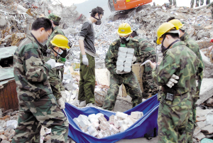 在長達(dá)6天的搜救過程中,北川縣日益成為危城。官兵們將資金、食品急送至鄰近的謝家坪村,那里有36戶受災(zāi)群眾;18日,他們將大量群眾轉(zhuǎn)移至安全地帶……同時,他們冒著余震不斷、堰塞湖隨時可能決堤的危險晝夜作業(yè),先后3次緊急修改搜救方案,共救出9名幸存者,并于21日傍晚成功挖出金庫庫款。官兵們將廢墟中散碎的人民幣逐一收撿入兩個大袋子,5個存放大量現(xiàn)金的保險柜也被逐一發(fā)掘出來——18時20分,第一批資金被清點出來;19時20分,搜救工作結(jié)束,北川信用聯(lián)社620余萬元資金完好無損(如圖)!官兵們繼續(xù)搜尋,包括記錄資金信息的筆記本電腦、憑證等均被搶救出來。