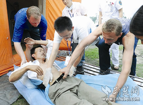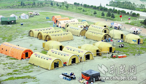 5月24日,汶川大地震后第12天,陽(yáng)光投射在彭州市職業(yè)中學(xué)操場(chǎng)上的20座巨型充氣帳篷上,不時(shí)有高鼻深目的“老外”進(jìn)進(jìn)出出。