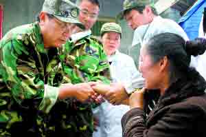 “醫(yī)生,我這只腳前幾天骨折了,地震的時候跑得太急又受了傷,你看能不能治一下!币晃淮迕駭D上來提出要求。人群中,一位醫(yī)生立即蹲下身去,仔細(xì)地察看起傷者沾滿泥濘的腳踝。村民們或許沒有注意到,眼前這位醫(yī)生的迷彩服上竟然戴著少將軍銜,或許他們更沒有料到,這位少將便是306醫(yī)院的院長,著名骨科專家鄒德威。鄒院長仔細(xì)捏了捏傷處,又詳細(xì)詢問了病情,微笑著告訴那位村民:“最近這幾天不要總下地走路,多注意休養(yǎng),很快就會好起來的!