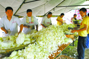 土坡上挖幾個(gè)大坑,直徑一米多的大鐵鍋架起來(lái),半鍋水沸騰,直徑一米的大圓木桶立在鍋中!盎鹜c(diǎn),再旺點(diǎn)!币粋(gè)小伙兒往坑內(nèi)塞木板,他五米外的木板堆,近一人高。旁邊大桶的米飯率先出爐,廚師劉福彬用臉盆當(dāng)飯勺。煮飯區(qū)旁邊,堆起的圓白菜面積像籃球場(chǎng)那么大。幾位女廚用大刀切菜。