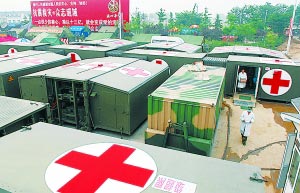 在綿竹市市政府旁邊的2萬(wàn)平方米的大塊空地上,一個(gè)個(gè)深綠色的“鐵皮大家伙”敦實(shí)地坐落在上。周圍的人告訴記者:“我們看病就鉆進(jìn)那個(gè)鐵家伙里面,不怕風(fēng)也不怕雨的,很好!”