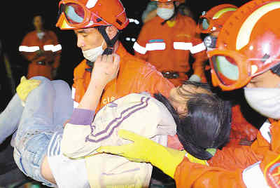 隊(duì)員們迅速行動(dòng),清理壓在她周圍的樓板斷層及碎石塊,隨行的醫(yī)療隊(duì)員張謙和張艷君則在一旁不停地鼓勵(lì)她。
