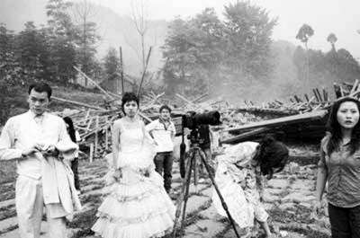 下午4時,現(xiàn)場一家婚紗攝影公司工作車?yán)锏膹V播聲傳來,說四川阿壩藏族自治州的汶川縣位于震中位置。這時,一個名叫黃芳的新娘開始抽噎。黃芳是藏族姑娘,父母、哥哥嫂子、姐姐姐夫還有4個孩子都在臥龍,那里恰好是震中!