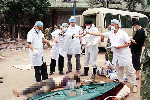 解放軍戰(zhàn)士不懈地挖掘,用雙手搬開大大小小的磚頭和石塊似的水泥碎塊,兩臺大型機(jī)械不停地工作,不時有遇難者尸體從廢墟中被發(fā)現(xiàn)。戰(zhàn)士們把這些尸體抬到路邊,有人專門噴灑消毒粉劑,然后我們便為死者清洗面部,以便家屬辨認(rèn),視聽技術(shù)人員拍照。無家屬辨認(rèn)的尸體,我們就從尸體肋部取下一塊軟骨放進(jìn)預(yù)先備好的固定液瓶里編號保存。挖出的尸體大多數(shù)都已變形,有的肢體殘缺,腐爛嚴(yán)重,操作者不得不戴上防毒口罩。