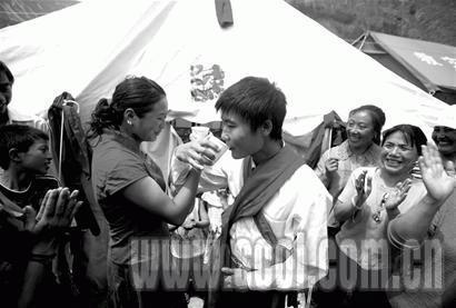 “親一個(gè),親一個(gè)!”在滔滔的岷江邊,在凌亂的廢墟旁,在簡(jiǎn)單的帳篷里,這樣的聲音對(duì)遭遇特大地震災(zāi)害后的汶川而言,顯得久違而珍貴。正是在這個(gè)重災(zāi)區(qū),在鄉(xiāng)親們熱情的呼喊中,昨日上午,汶川縣威州鎮(zhèn)雙河村的一對(duì)年輕羌族戀人攜手走進(jìn)婚姻殿堂,為這個(gè)劫后重生的地方增添了一些喜氣。