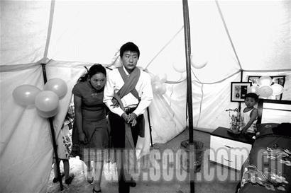 災(zāi)難突如其來(lái),再談婚禮的事情顯然不合時(shí)宜,對(duì)重災(zāi)區(qū)汶川來(lái)講尤其如此。雙河村的房屋在地震中坍塌了不少,其他的房屋也基本上成為危房,在吃穿住都成問(wèn)題的情況下,王小波和郭富娟的婚禮逐漸被人遺忘。“地震后的那些天,可以說(shuō)連吃住的地方都沒(méi)有。”王小波說(shuō),地震是他們從來(lái)沒(méi)遇到過(guò)的困難,當(dāng)天還下了很大的雨,躲在一個(gè)棚棚里,冷得不得了,吃的也沒(méi)有,所有的村民都處于恐慌中。好在很快就有部隊(duì)幫他們搭建起了成排的帳篷,隨后有人送來(lái)了食物,還有人來(lái)消毒防疫。