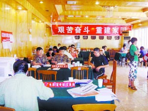 在餐廳一角,堆放著不少單位的標牌,這些單位還沒有在辦事處設(shè)點!坝械氖菍嵲诔椴怀鋈耍有的根本沒法派人來。”宣傳部一位工作人員介紹,有些單位在地震后就完全沒有人了,“太慘了”。