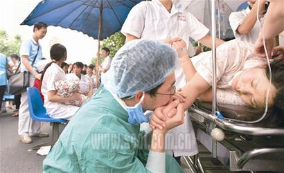 第二天,無數(shù)記錄地震的照片在各種報(bào)紙、網(wǎng)絡(luò)上刊出,其中一張由我拍攝的圖片——《丈夫親吻待產(chǎn)妻子》在本報(bào)見報(bào)后,又被諸多電視臺和各大門戶網(wǎng)站使用,央視插片使用了這張照片,網(wǎng)友們積極跟帖評論,稱其是“網(wǎng)上十大感動照片”。有網(wǎng)友說,照片上夫妻倆緊緊握著彼此的手,沒有任何言語,深情一吻傳遞出的是感動、幸福和振奮,“此時(shí)無聲勝有聲”地傳遞著“別怕,有我在!”、“我會堅(jiān)強(qiáng)的,我會挺住的!”的心靈對話。丈夫親吻妻子是平常之事,但在災(zāi)難面前此舉則多了一份責(zé)任和承諾,也平添了許多甜蜜和溫存。這凝固的一刻一直深深地感動著人們。