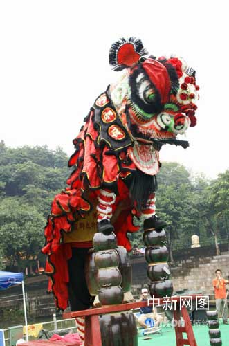 廣東南海西樵山上的天湖公園,一支來(lái)自廣東臺(tái)山的傳統(tǒng)南獅正在進(jìn)行絕技表演, “獅子踩沙煲”、“南獅勇闖鐵板橋”接連上演。