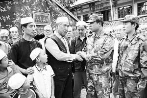 悠長的誦經(jīng)聲在“帳篷清真寺”四周縈繞。蒿溪回族鄉(xiāng)鄉(xiāng)長魏光忠正巧上山來查看危房!爱(dāng)年,紅軍經(jīng)過此地,與當(dāng)?shù)鼗、漢群眾結(jié)下了深厚的情誼。今天,‘民族大團(tuán)結(jié)、軍民一家親’的動(dòng)人情景在蒿溪再現(xiàn)。”魏光忠告訴記者,連日來,部隊(duì)官兵搜救搶險(xiǎn)不懼艱險(xiǎn),運(yùn)送物資不知疲倦,還專門開設(shè)了多個(gè)“清真救助站”。