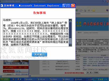 本報(bào)記者隨即與馬先生取得聯(lián)系,他當(dāng)著記者的面,用記者的電腦打開了在 “中國·上!闭W(wǎng)站上的信箱。記者看到信箱內(nèi)有自去年至今的來往信件,這些信件均反映周家渡街道侵占東明家園公建配套設(shè)施事宜。記者點(diǎn)擊了今年5月4日收到的標(biāo)題為 “周家渡街道網(wǎng)上信訪中心處理答復(fù) ‘馬根祥2008年1月11日……’”標(biāo)題的回復(fù)信件,在彈出的窗口中,被馬先生稱為 “史上最!毙姓貜(fù)隨即呈現(xiàn)在記者眼前: