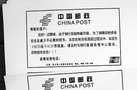 經(jīng)過審訊,班某和甘某很快交代了他們詐騙作案的過程。據(jù)二人交代,他們先用塑料板將ATM機(jī)的出鈔口堵住,并在ATM機(jī)上貼上提示,內(nèi)容是:“尊敬的客戶,當(dāng)您取款不出鈔時,請及時撥打銀行服務(wù)電話××××、××××與客服中心聯(lián)系,否則后果自負(fù)(上圖)。有粗心的客戶提款不出鈔時,可能會撥打廣告牌上的服務(wù)電話。