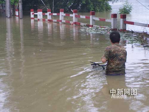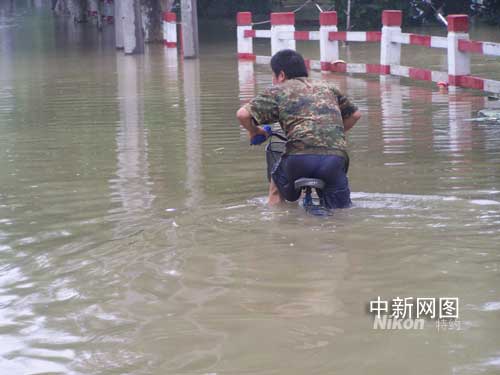記者跟隨當(dāng)?shù)卣ぷ魅藛T乘坐沖鋒舟慰問救助留守居民途中,在當(dāng)?shù)匾巡糠直谎蜎]得西溪街,一身穿迷彩服、短褲的中年男子騎著自行車順著街道水面駛來。讓人驚嘆的是,自行車車身完全淹沒在水中,人們從上面只能看到水中的車把手。該男子笑著對(duì)工作人員打了招呼,擦船而過,駛過一段路之后,自行車車身才逐漸露出水面。