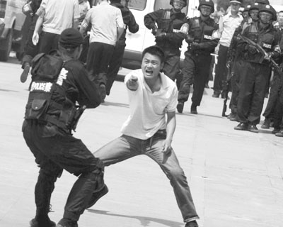 6月21日上午,太原火車站第四候車廳突發(fā)爆炸,旅客受傷,歹徒就出沒在現(xiàn)場,情況緊急,太原鐵路公安局緊急出動,處置不明爆炸物、撲救火災(zāi)、搜索爆炸物、拆除爆炸裝置、抓獲歹徒、解救出人質(zhì)。半個小時的時間,成功地解除了危機(jī),完成了迎奧運(yùn)保安全反恐防暴實(shí)戰(zhàn)演練。