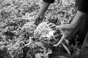 昨日下午6時許,露天瓜地中隨處可見被砸裂的西瓜,有的“傷口”就像子彈打進(jìn)去一般。“幸免的很少。”瓜農(nóng)張平翻看瓜秧,藏在下面的西瓜也裂了口。