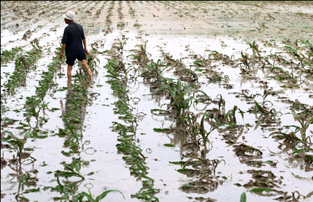 72歲的于大爺在德惠達家溝鎮(zhèn)已經(jīng)生活了幾十年,記者看到他時,他正在搶救地里的秧苗。不遠處的壟臺上,托人情請來的柴油機水泵正在從田里往外不停地抽水。于大爺告訴記者,他家這次被水淹的地大概有一坰左右,底肥加上追肥現(xiàn)在起碼投入5000多塊錢,目前他們這里的玉米收購價是0.78元一斤,算下來一坰地得損失一萬多。同樣被水淹的曹國梅家四畝地也得損失2000多塊錢。