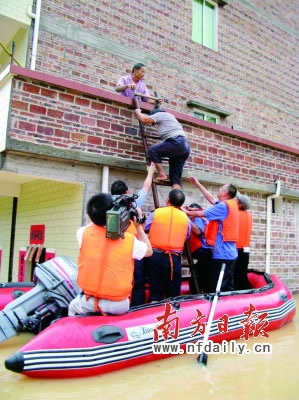 昨日下午4時許,筆者在該縣播植鎮(zhèn)龍福村委看到,屬下的龍村、羅榕、灣頭等10條村莊已是一片澤國,村道一端和樓房上零星散布的村民正在等待救援,幾艘沖鋒舟和橡皮艇來回穿梭,把村民們載到安全地帶(如右圖)。從市里全會請假回來的縣委書記譚培安也親臨“澤國”指揮救援,數(shù)十名縣鎮(zhèn)領(lǐng)導(dǎo)干部正在現(xiàn)場忙碌,村中還不時傳出如放鞭炮般的倒房聲。一位剛剛被救出的80歲的阿婆說,活這么大歲數(shù)還未見過如此大的暴雨和山洪。據(jù)悉,該鎮(zhèn)前日起遭受暴雨襲擊,導(dǎo)致當(dāng)?shù)貝偝呛臃簽E,河基崩潰嚴(yán)重,河水倒灌入村,受浸村莊10多條,受困村民2526人,倒塌房屋117戶352間。前晚起,縣、鎮(zhèn)、村干部齊出動,分頭深入受災(zāi)村莊連夜動員村民撤離,至昨日下午,已全部安全轉(zhuǎn)移。(圖/文談細(xì)育龍許李均陽)