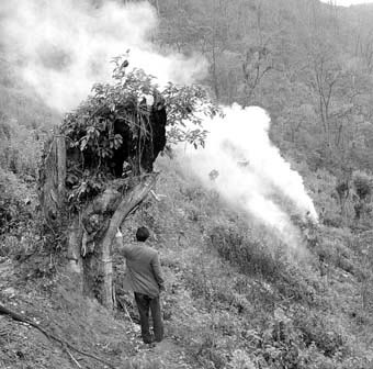 從西雙版納景洪市往景訥鄉(xiāng)走,一路上看到的全是光禿禿的山頭,樹木橫七豎八地倒在一旁,還冒著滾滾濃煙!敖鼛啄暌?yàn)橄鹉z價(jià)格飛漲,整個(gè)西雙版納開始大規(guī)模毀林種膠。樹木砍倒后運(yùn)不出去,就只有放火燒掉,同時(shí)還能做橡膠林肥料,我們這里又回到了‘刀耕火種’的原始社會(huì)了!笨蛙囁緳C(jī)說(shuō)。