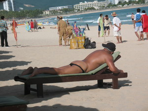 在南中國(guó)酒店西側(cè)海灘,十多名男子赤裸裸地曬太陽(yáng),裸曬者均為男性,他們?nèi)沓嗦,皮膚曬得很黑。據(jù)裸曬者自己解釋,他們裸曬是為了治療皮膚病。記者問(wèn)他們?yōu)槭裁床贿x擇隱蔽的地方裸曬,他們并沒(méi)有回答。
