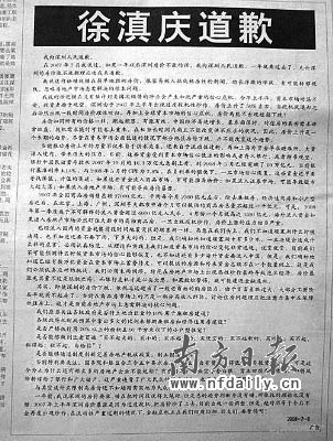 徐滇慶刊登在《南方都市報(bào)》上的道歉廣告。