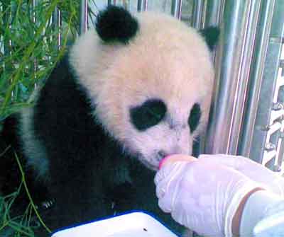 在陜西省寶雞市太白縣被營救的野生大熊貓6日被送到省大熊貓搶救中心后,一直拒絕人工飼養(yǎng),到現(xiàn)在也不進食,任憑大家用各種食物引誘,就是不吃。