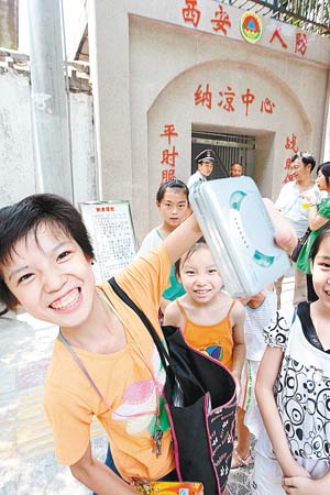 帶著隨身聽(tīng)進(jìn)防空洞納涼,這名小朋友難掩興奮之情。